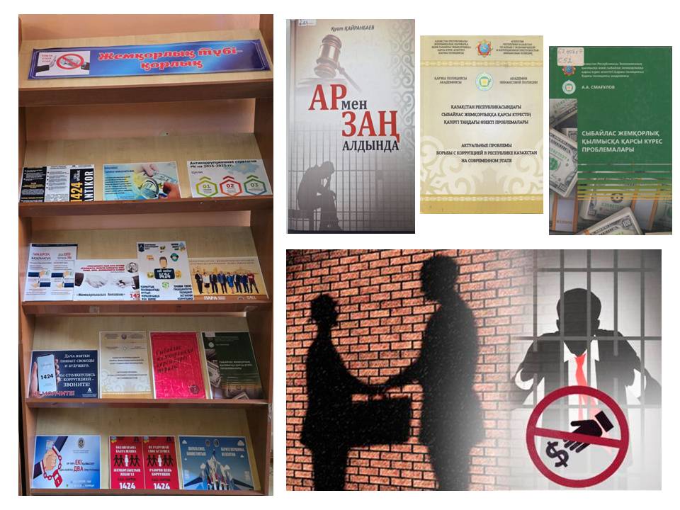 Кітапхана фойесінде «Жемқорлық - түбі қорлық» ескерту - көрмесі жұмыс істейді. Көрменің міндеті - сыбайлас жемқорлыққа қарсы іс - қимылдың негізгі мәселелерін жария ете отырып, сыбайлас жемқорлыққа қарсы іс - қимылдың әзірленген жүйесімен таныстыру. Онда сыбайлас жемқорлыққа қарсы заңдар және сыбайлас жемқорлыққа қарсы іс - қимылға бағытталған құқықтық актілер туралы ақпарат ұсынылған. Бұл көрменің мақсаты - сыбайлас жемқорлыққа қарсы қоғамдық сананы, сыбайлас жемқорлық көріністеріне төзбеушілікті қалыптастыру.